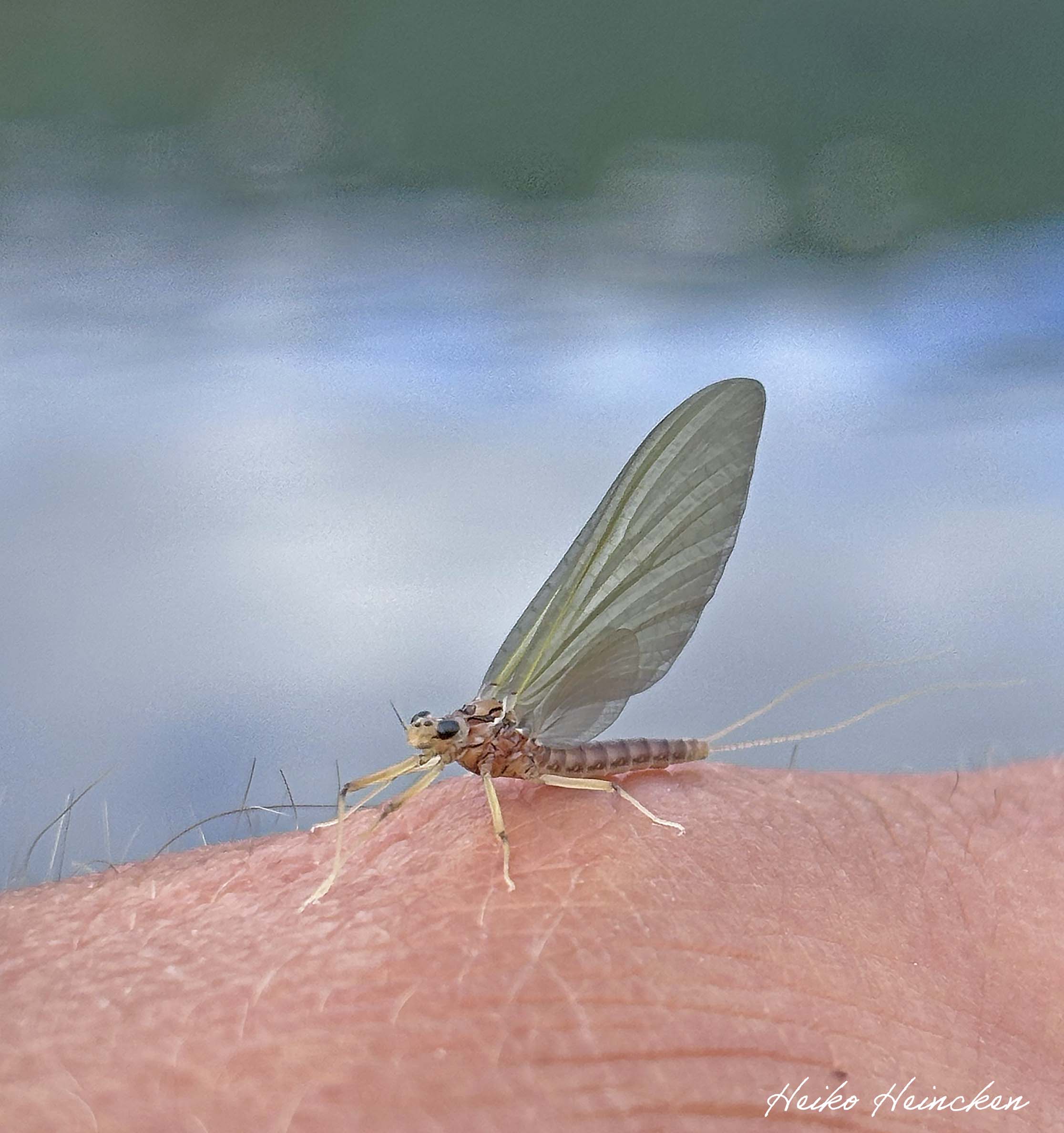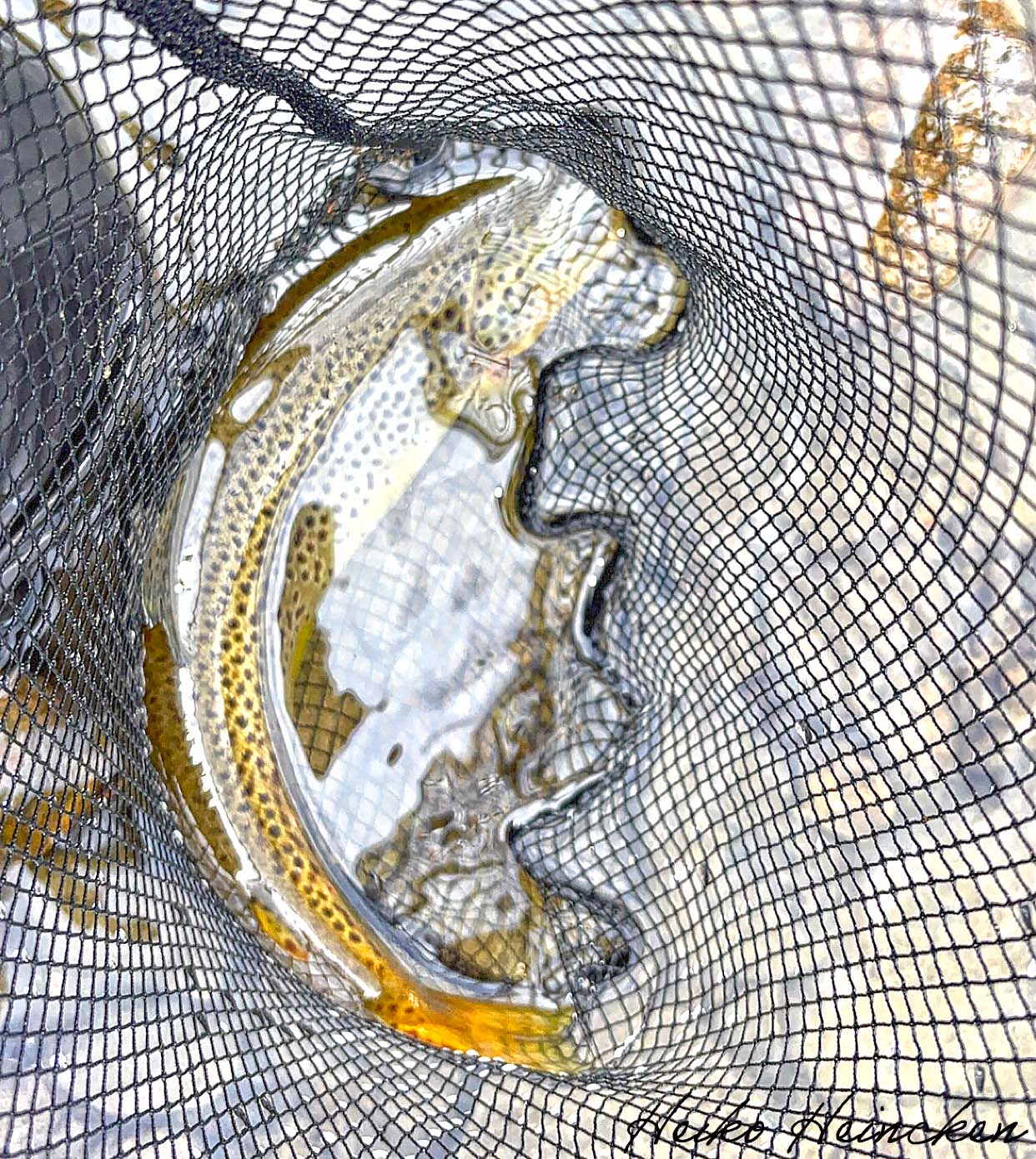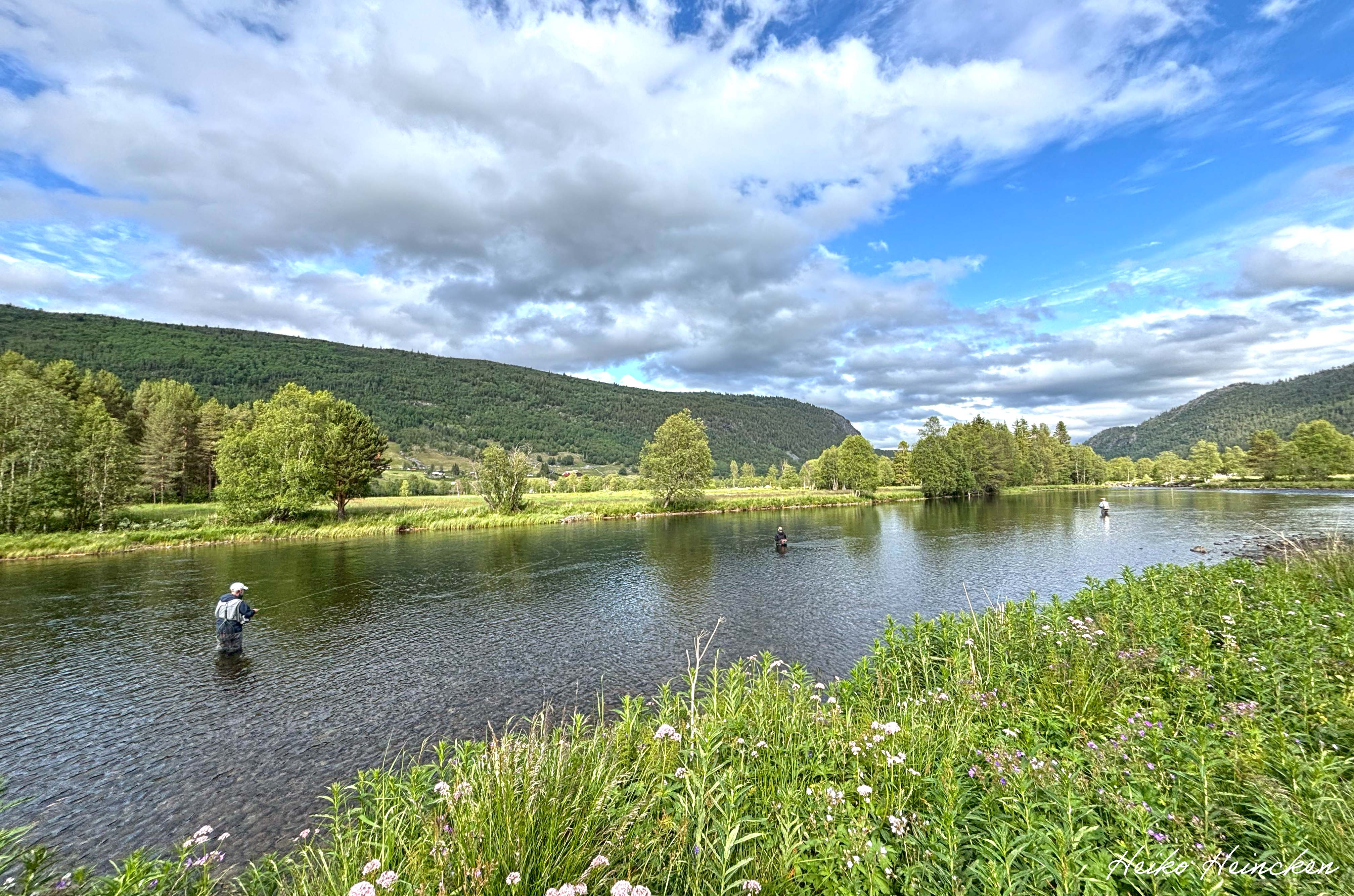En av dagene da vi alle var ved samme plass i elven, ble det en voldsom klekking av noe….noe som var grisesmått og som var ei lita døgnflue som var #18-20. Det vaka og vaka og fortsatte å vake, men våre fluer skei over fiskene uten. at det så mye som litt var interesse. Morten, Line. Ragnar og jeg var tjangseløse og her var det ikke snakk om erfaring, men rett å slett å treffe den fisken som på en eller annen mulighet gjorde en feil, og det skjedde jo ikke!