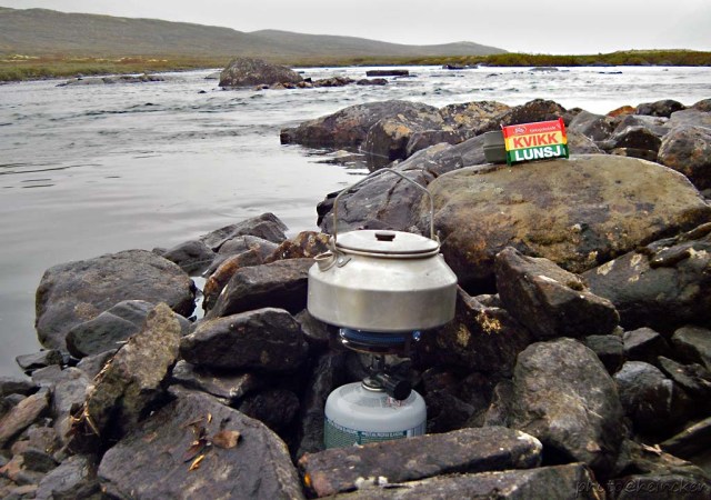 ….og hva gjør man når fisken ikke er der eller ikke blir fristet av vårfluer eller streamere, jo fyrer kaffe og koser seg med det man har med i dagstursekken! Enkle kår blir en mager trøst!